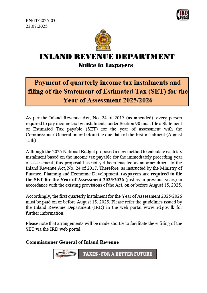 The Department of Inland Revenue has released the latest Statement of Estimate Tax guidelines applicable to both corporates and individual taxpayers.